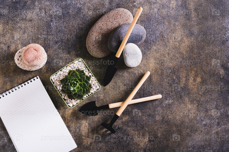 Сочные в горшке и инструменты для домашнего садоводства на столе