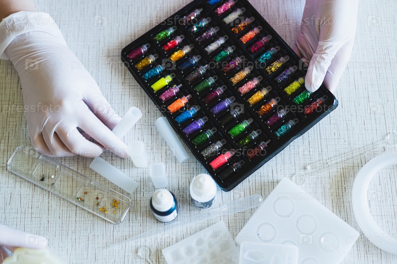 Женские руки в перчатках держат набор блесток для изготовления украшений из эпоксидной смолы