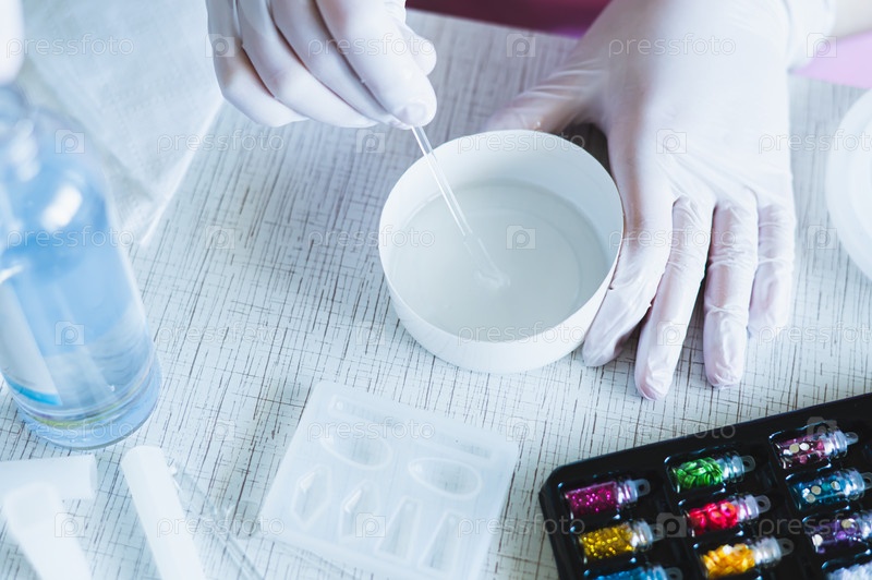 Женские руки в перчатках смешивают эпоксидную смолу в миске для изготовления украшений