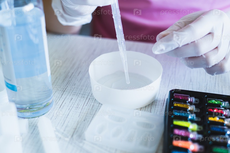 Женские руки в перчатках выжимают эпоксидную смолу из пипетки в миску для изготовления украшений