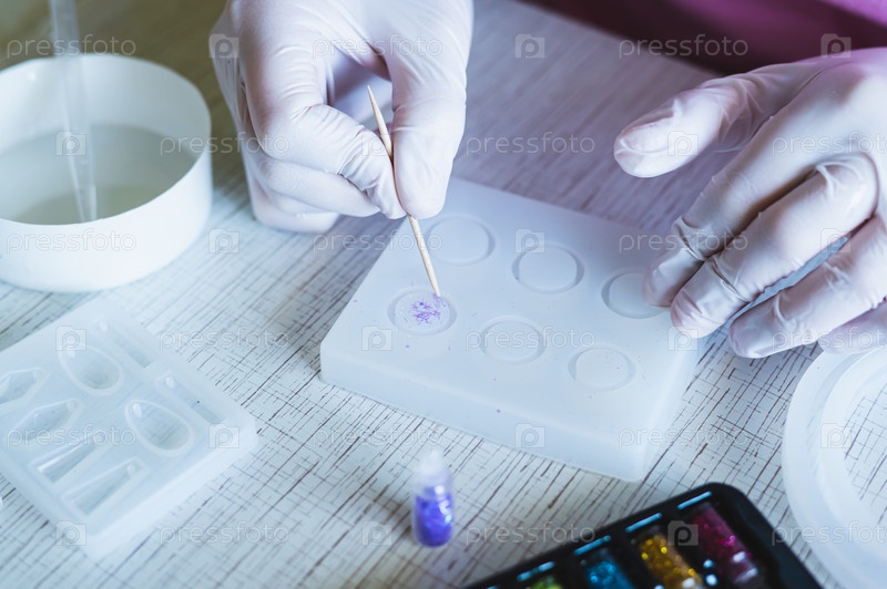 Женские руки в перчатках заполняют форму кольца из эпоксидной смолы блестками