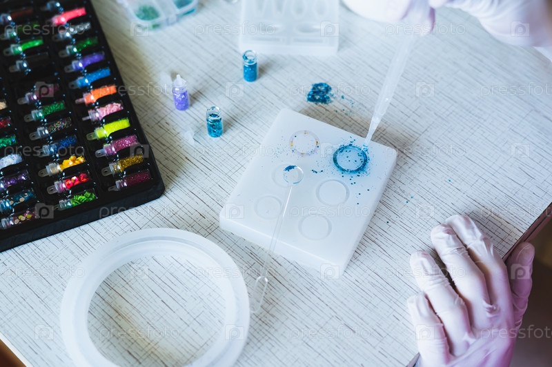 Детские руки в перчатках заполняют форму для изготовления кольца эпоксидной смолой