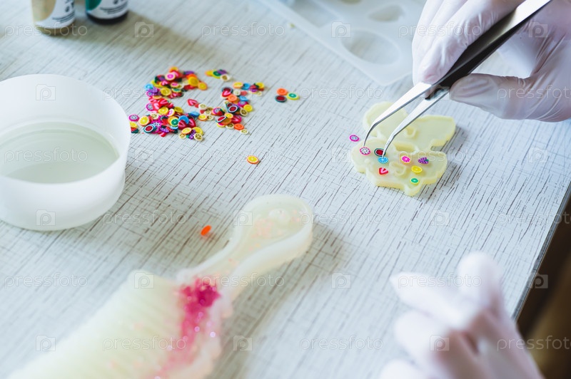 Девушка в перчатках пинцетом помещает элементы в форму для изготовления сережек из эпоксидной смолы
