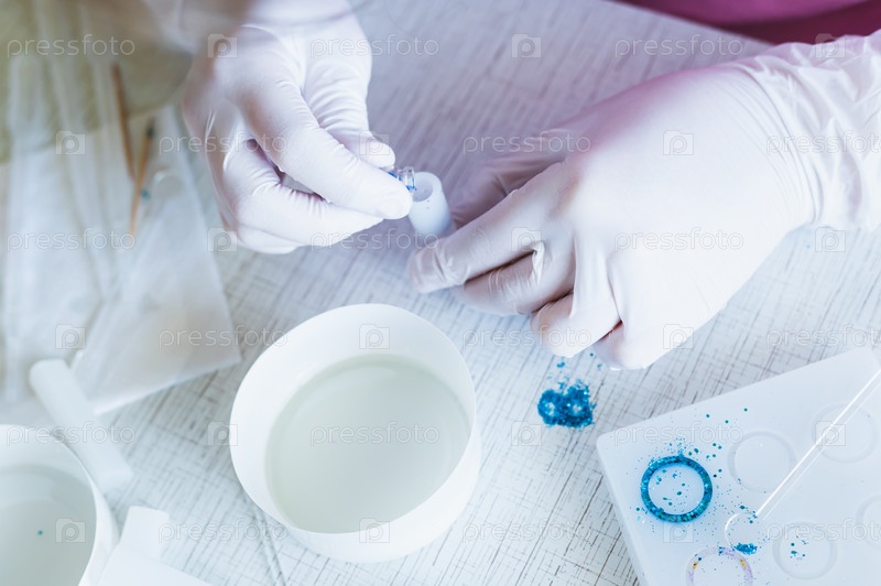 Женские руки в перчатках льют блестки в форму для изготовления кулона из эпоксидной смолы