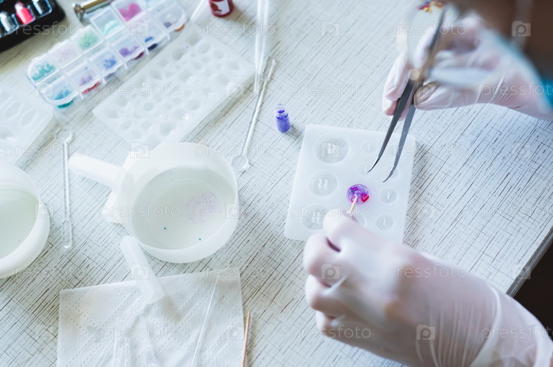 Женские руки в перчатках заполняют форму для пуговиц из эпоксидной смолы декоративными элементами
