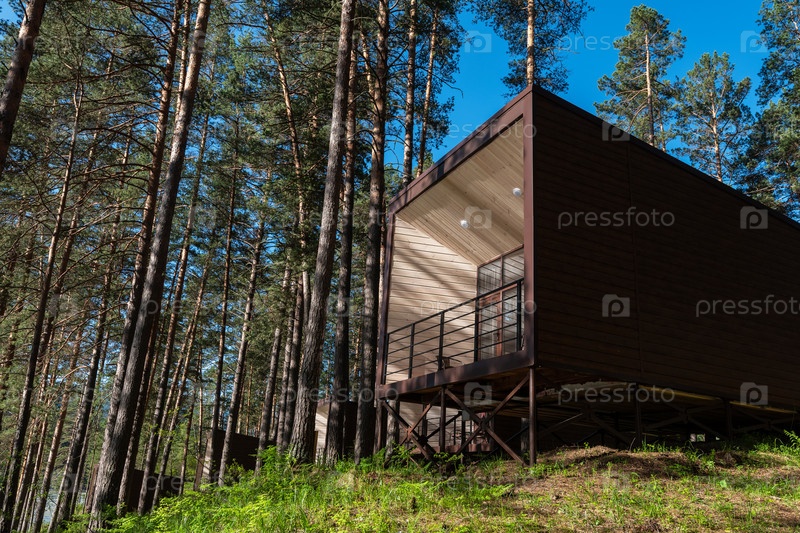 Дом или гостиница с панорамными окнами в сосновом лесу. Прекрасное летнее утро с ярким солнцем. Концепция природы или отдыха и путешествий