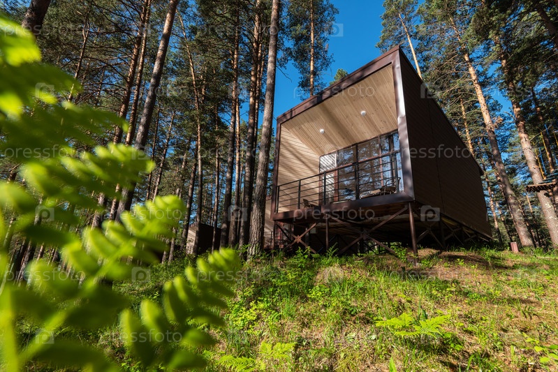 Дом или гостиница с панорамными окнами в сосновом лесу. Прекрасное летнее утро с ярким солнцем. Концепция природы или отдыха и путешествий