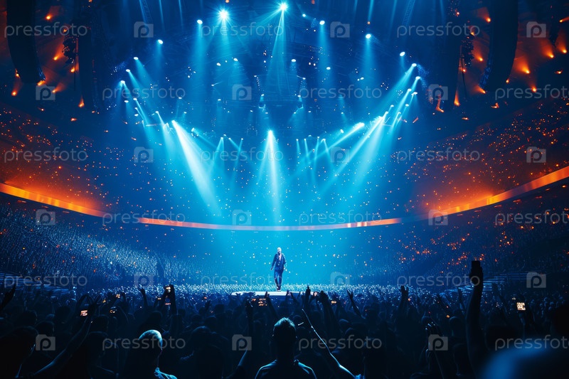 Певица дает музыкальный концерт на сцене в огромном переполненном зале стадиона