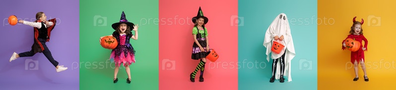 Дети в карнавальных костюмах на многоцветном фоне
