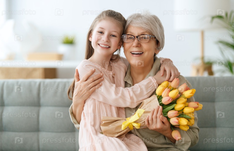 Бабушка и девочка улыбаются и обнимаются