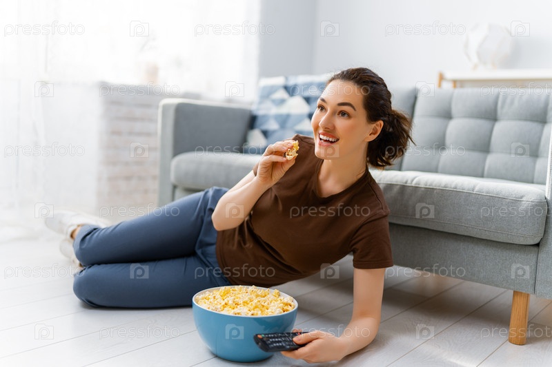 Молодая женщина смотрит телевизор