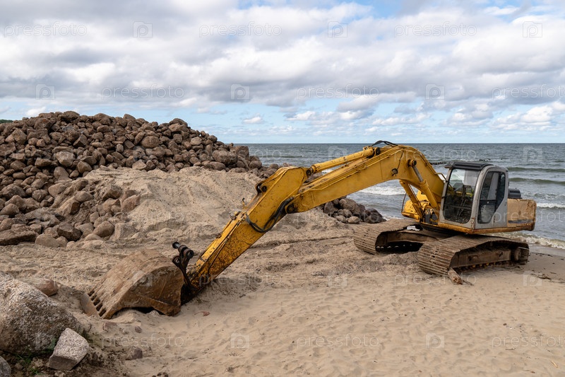 Экскаватор в море. Строительная техника на берегу моря. Строительство береговых укреплений