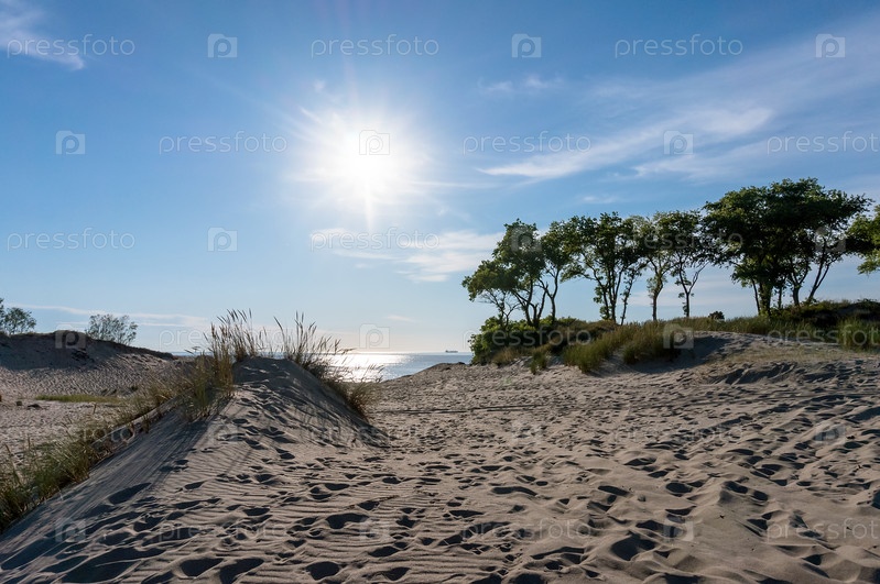 Песчаная дюна на закате. Морские песчаные холмы в солнечном свете
