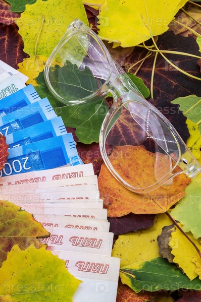 Деньги на осенние листья. Русские деньги и очки. Осенний натюрморт