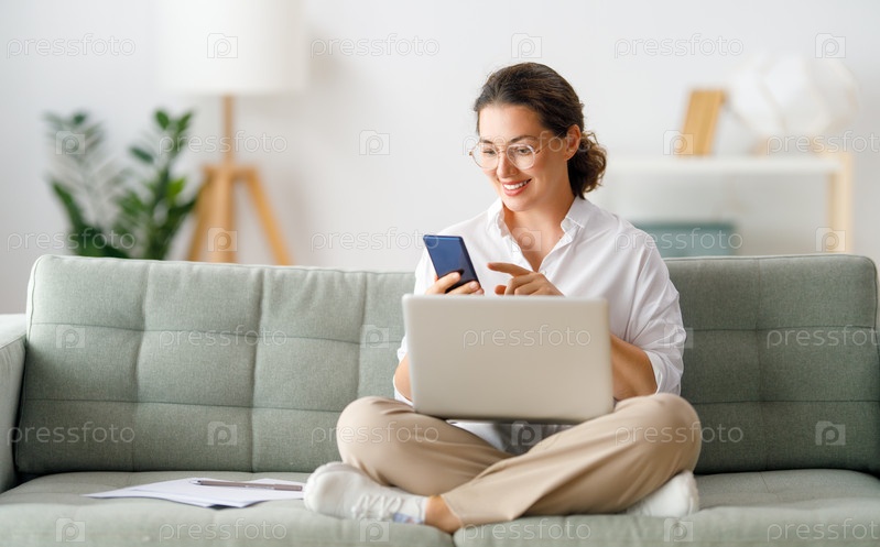 Женщина работает дома за ноутбуком