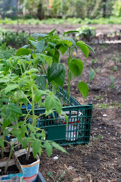 Фермер сажает рассаду помидоров в органическом саду. Высадка молодого растения в грядку
