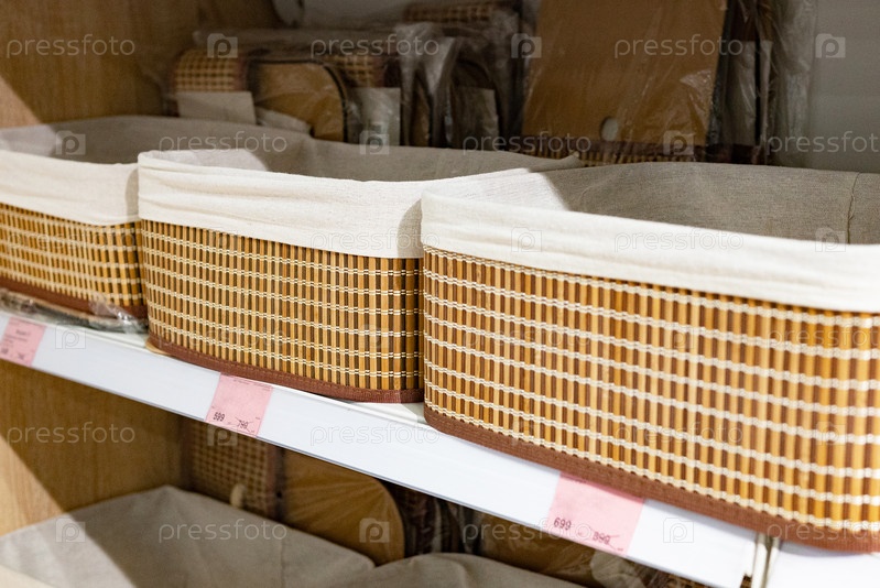 Пустая плетеная корзина на кухонном столе, на фоне мраморной стены. корзина для хлеба и фруктов