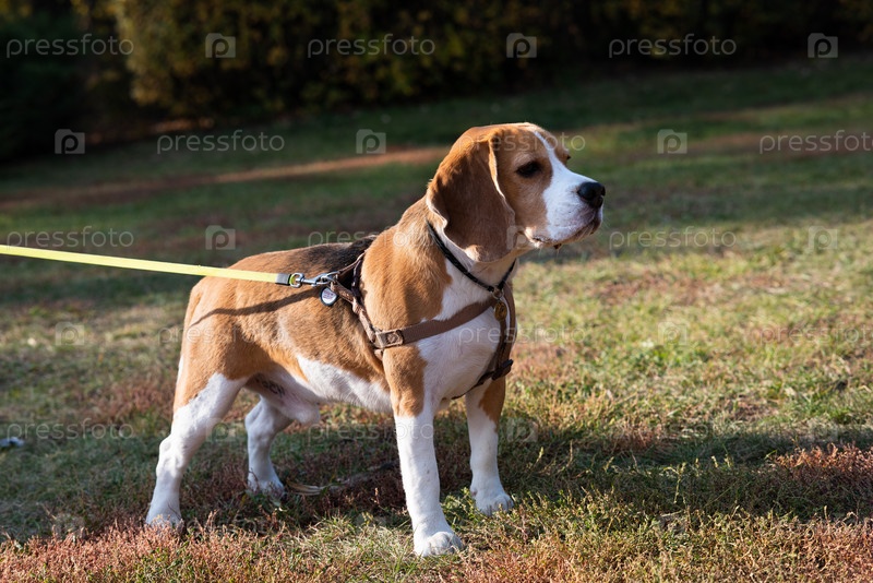 Собака Бигль на прогулке рано утром на рассвете