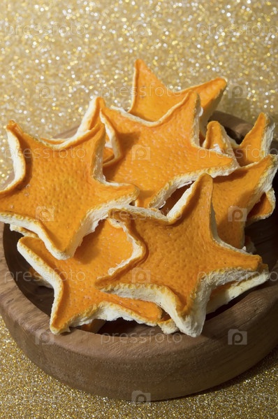 Сушеная кожура апельсина в виде звездочек на золотистом фоне