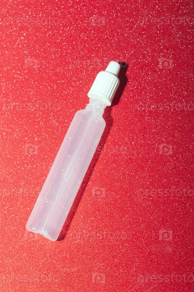 Флакон с глазными каплями из пластика прозрачный на красной поверхности