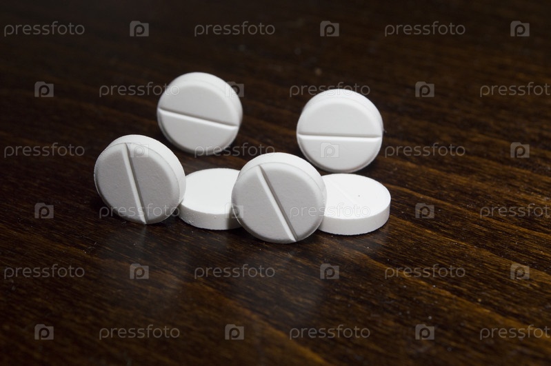 Белые круглые таблетки на деревянной поверхности. Лекарственный препарат