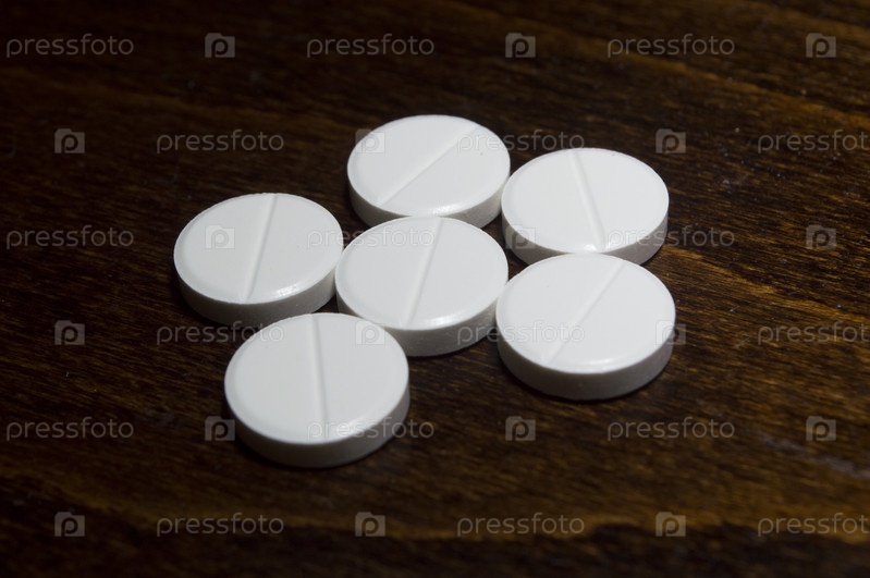 Белые круглые таблетки на деревянной поверхности. Лекарственный препарат
