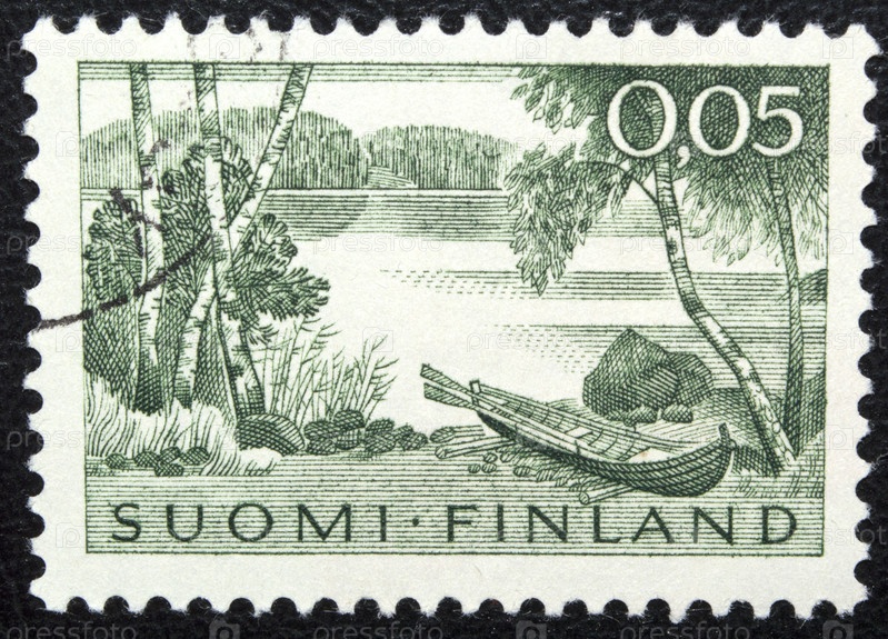 Почтовая марка с гашением Финляндия 1963 год. Пейзаж с озером и весельной лодкой