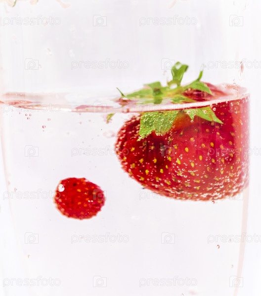 Крупный план клубники и земляники в воде. Кадр хорош для рекламы. Концепция