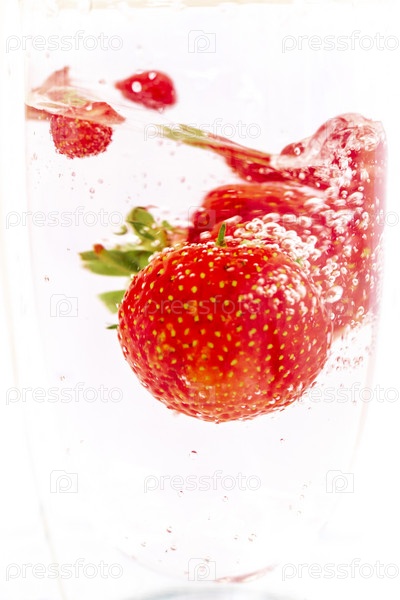 Крупный план клубники и земляники в воде. Кадр хорош для рекламы. Концепция
