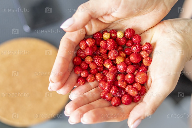 Крупным планом женщина держит землянику. Ягоды напоминают форму сердца. Кадр хорош для рекламы. Концепция