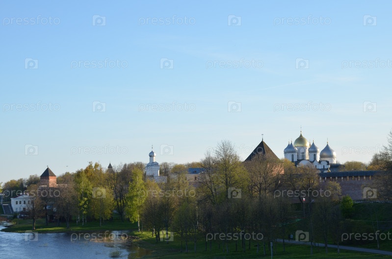 Вид на Кремль Великого Новгорода и реку Волхов в весенний вечер
