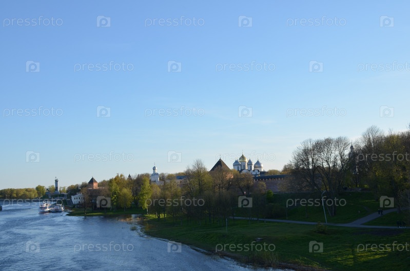 Вид на Кремль Великого Новгорода и реку Волхов в весенний вечер