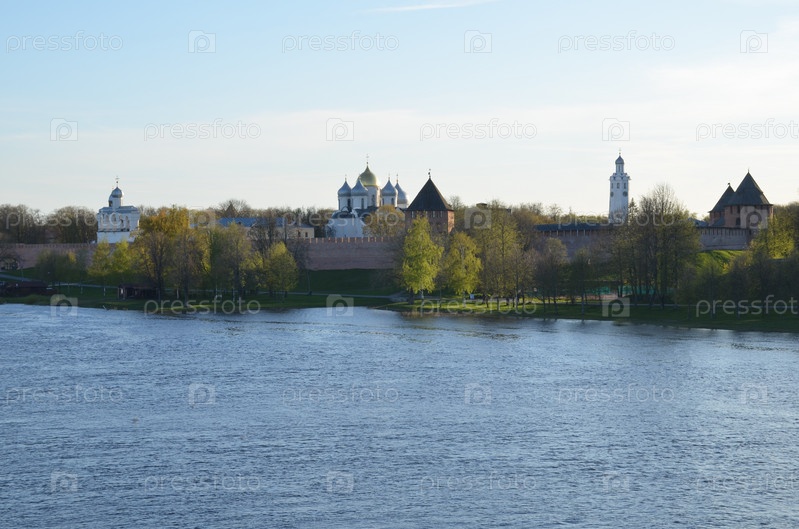 Вид на Кремль Великого Новгорода и реку Волхов в весенний вечер