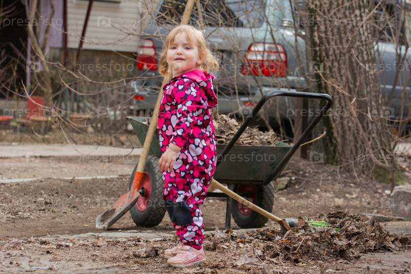 Двухлетняя девочка самостоятельно собирает листья метлой