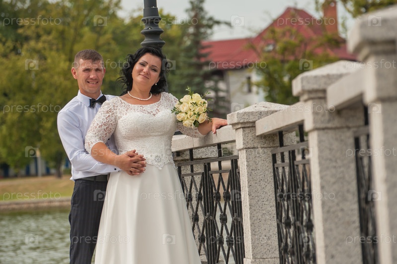 Улыбающиеся и счастливые жених и невеста во время свадебной прогулки на природе