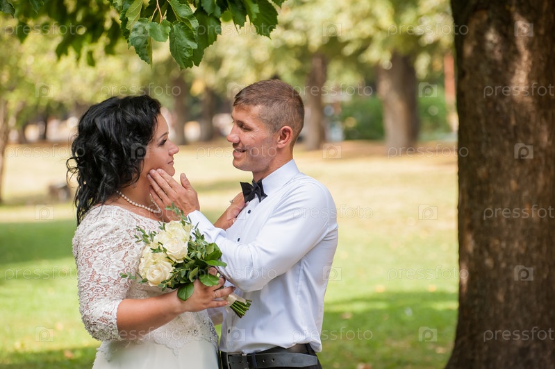 Жених и невеста смотрят друг на друга и нежно ласкают руки