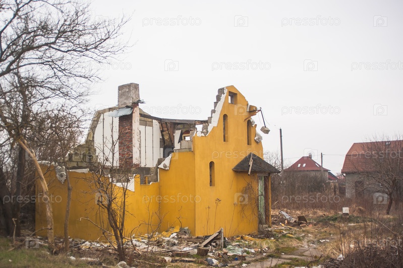Разрушенные, старые дома перед сносом, дом без крыши, только стены
