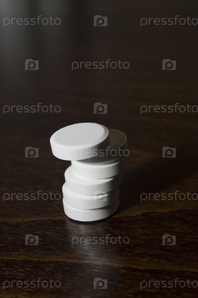 Белые круглые таблетки на деревянной поверхности. Лекарственный препарат