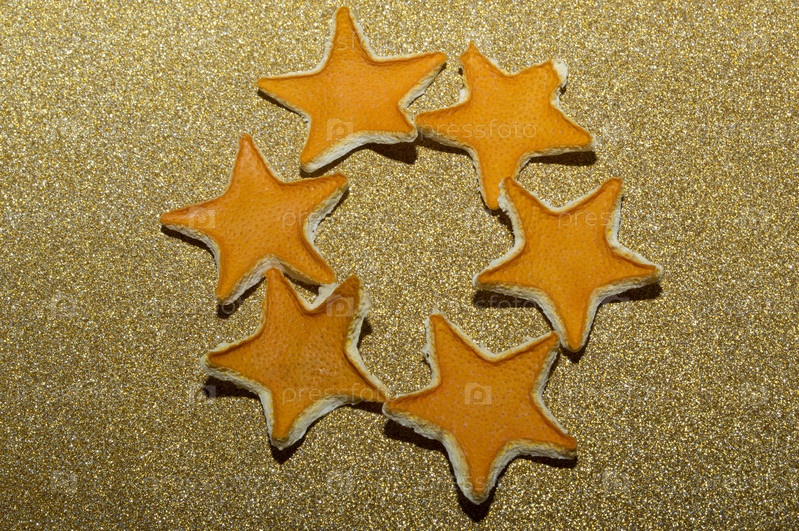 Сушеная кожура апельсина в виде звездочек на золотистом фоне