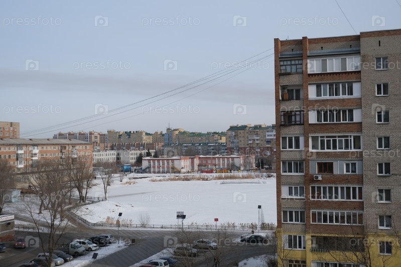 Вид из окна на городской пруд зимой Омск