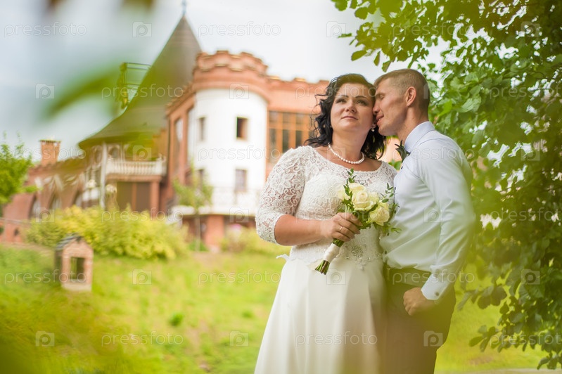 Жених и невеста крепко-крепко обнимаются на свадебной фотосессии