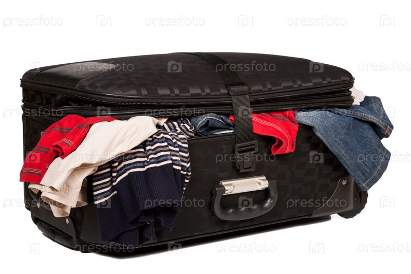 Переполненный чемодан на белом фоне