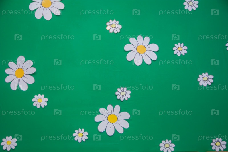 Украшение, белые ромашки на зеленом фоне из текстиля