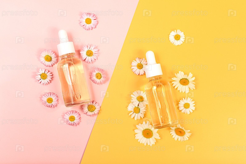Бутылки с лосьоном с экстрактами ромашки и цветами на светлом фоне, концепция натуральной органической косметики, реклама спа и магазина, вид сверху