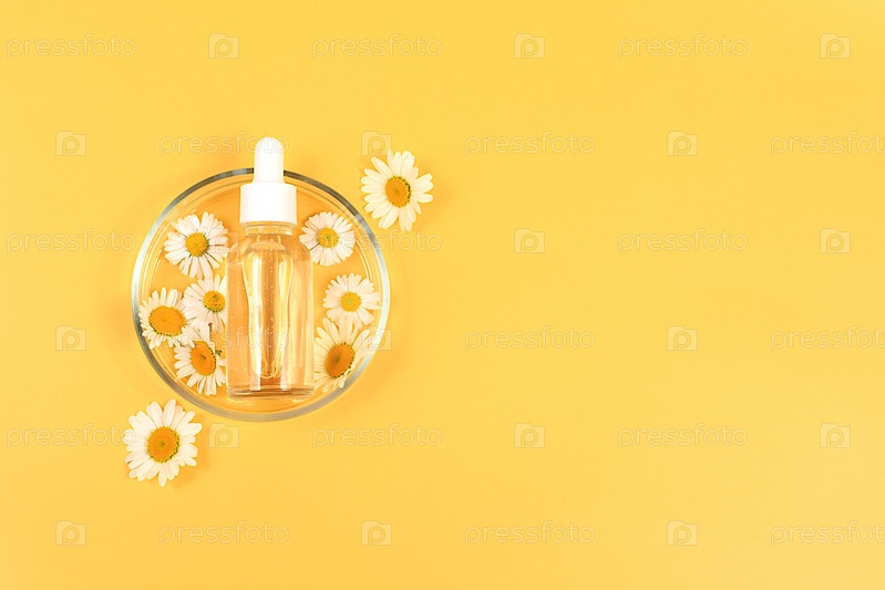 Бутылки с лосьоном с экстрактами ромашки и чашки Петри с цветами ромашки на светлом фоне, концепция натуральной органической косметики, реклама спа и магазина, вид сверху