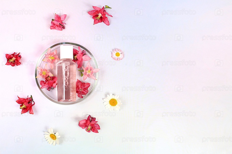 Бутылки с лосьоном с экстрактом архиды для тела и чашки Петри с цветами на розовом фоне, концепция натуральной органической косметики, реклама спа и магазина, вид сверху