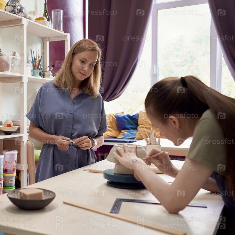 Учительница керамики смотрит на молодого ученика, занимающегося гончарным делом в мастерской