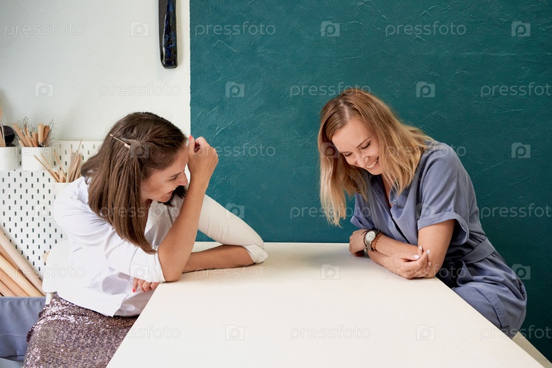 Две красивые женщины смеются. Женщина-предпринимательница сидит за столом на рабочем месте и разговаривает, развлекается