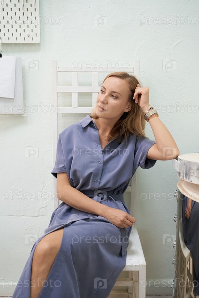 Задумчивая блондинка в платье сидит в мастерской и смотрит в сторону