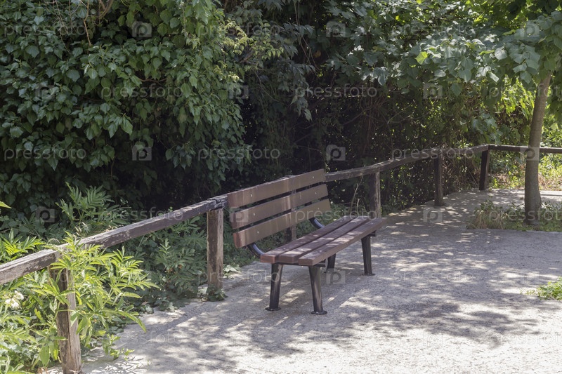 Пеший туризм. Скамейка в тени деревьев крупным планом